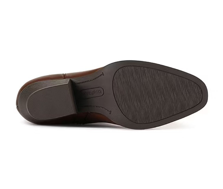 Channel your inner cowgirl with Frye & Co. women's faux leather Sheldon cowboy boots. Fitted to a knee-length, they have a cushioned insole for added comfort, a pointed toe, a stacked heel, a side zip for easy on-and-off. Perfect for any western-inspired look.