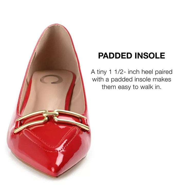 Our Rumi heels from Journee Collection are as effortless as they are chic with their slip-on silhouette, patent luxe faux leather, and hardware detail. As a bonus, their padded footbed will have you walking around in comfort.
