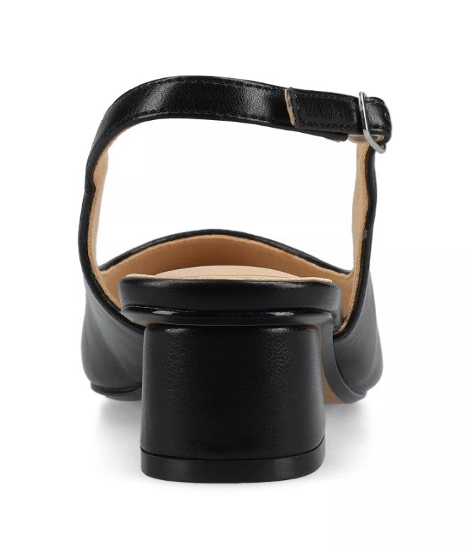 The Sylvia heels from Journee will have you leaving your house comfortable with their padded footbed. Keeping you in the new with fashion, their supple vegan leather, sling-back crossover strap design, and pointed toe will do just that. As a bonus, their pull-on closure will make them an easy shoe to put on when leaving the house.